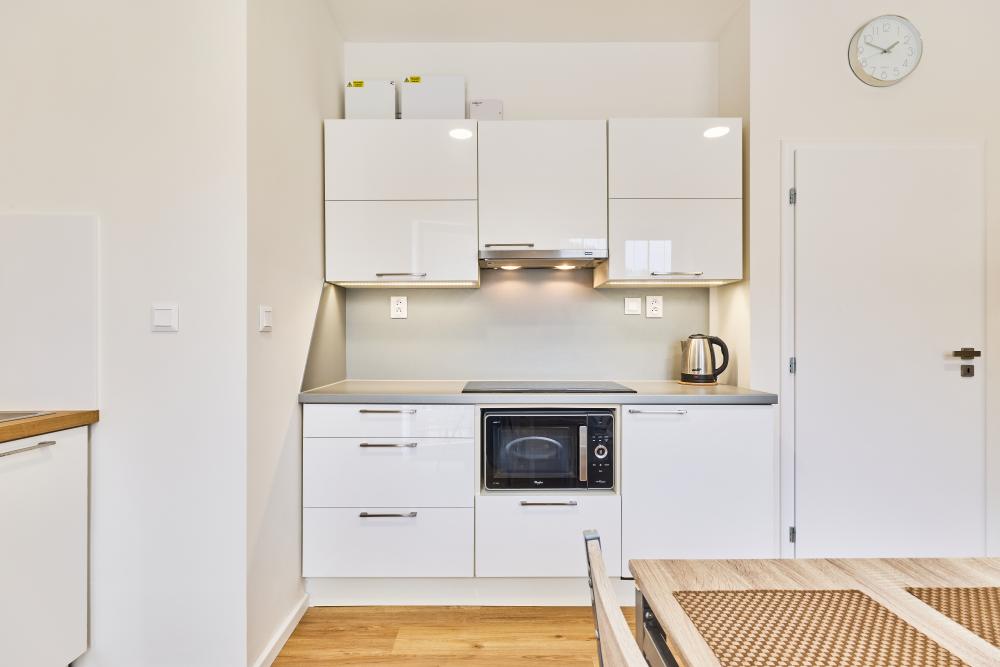 výhled z balkónu, TV, topení, paketová podlaha, skříň/šatna, věšák na oblečení, kuchyňský kout, lednička s mrazákem, mikrovlnná trouba, jídelní kout, rychlovarná konvice, kuchyňské potřeby, varná deska, koupelna se sprchou, toaleta, ručníky, povlečení, toaletní papír, smetáček a lopatka.