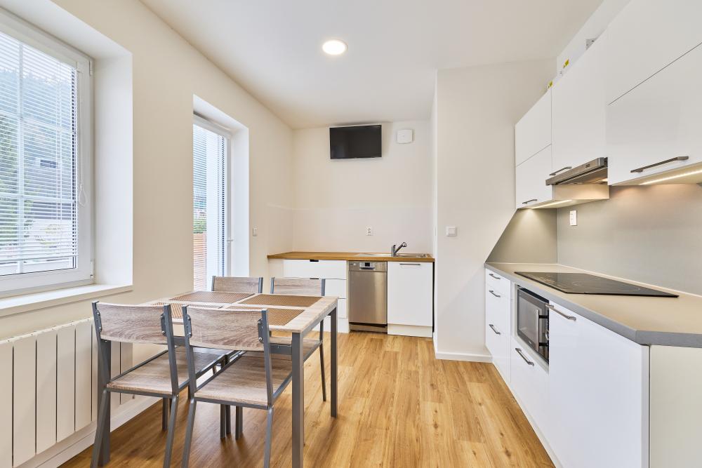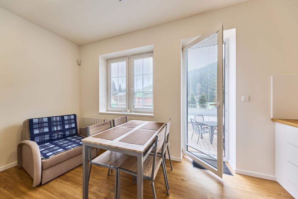 Kuchyně s jídelním koutem, posezením a se vstupem na terasu